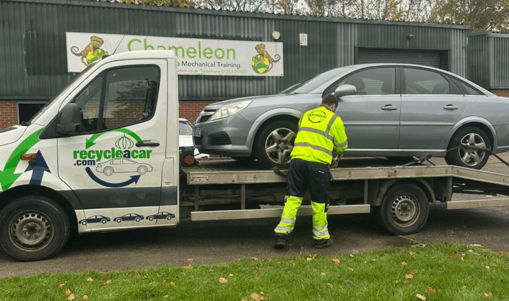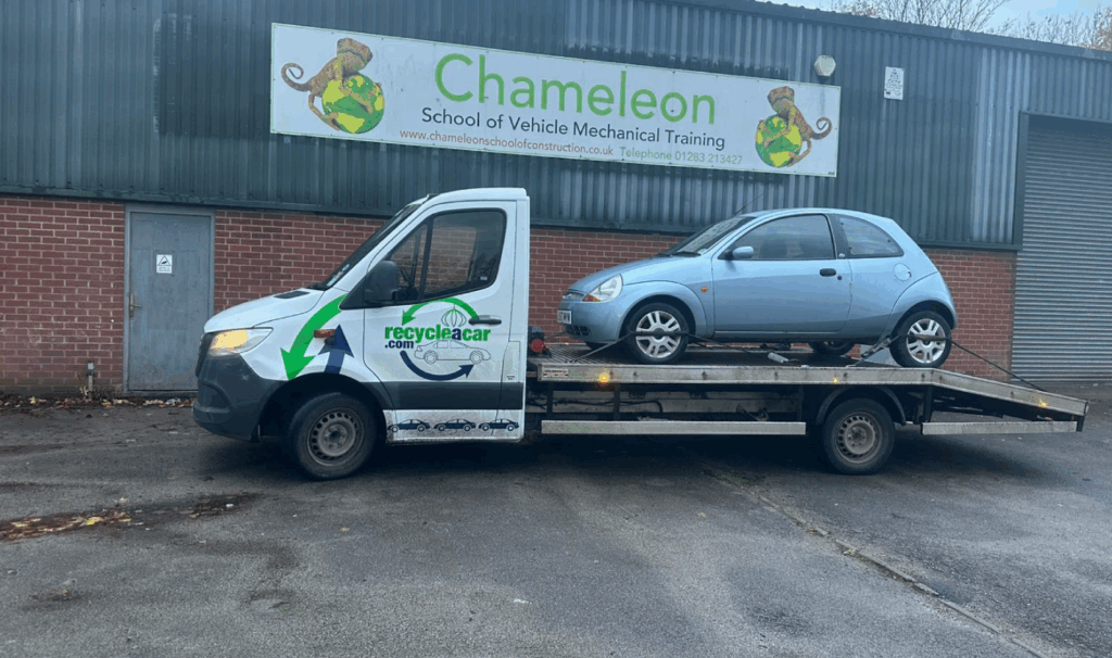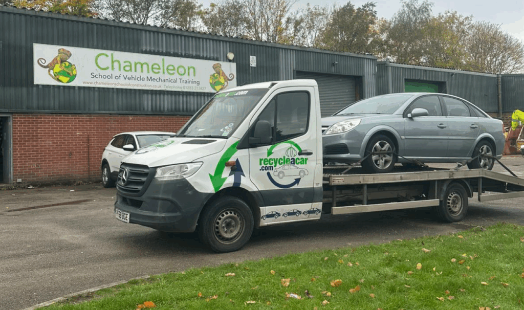 The Recycle a Car team has pledged to support the college with a regular supply of end of life vehicles for the students to practice on, to help them learn their way around an engine. The first vehicle delivered to Chameleon’s Swadlincote campus was a 58 plate Vauxhall Vectra, which is already being put to good use in the workshop.